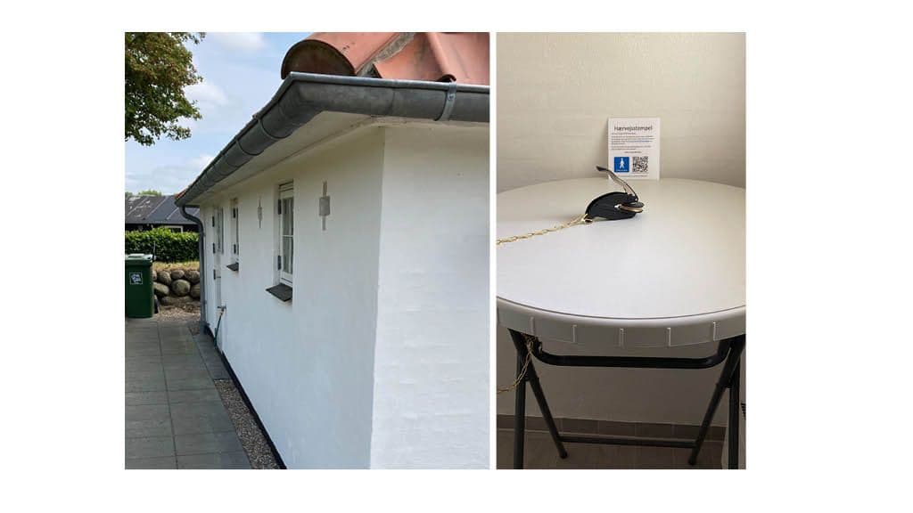 Find the stamp: The stamp can be found at Skivum Church, on a table in the toilet building, which is located within the dike.